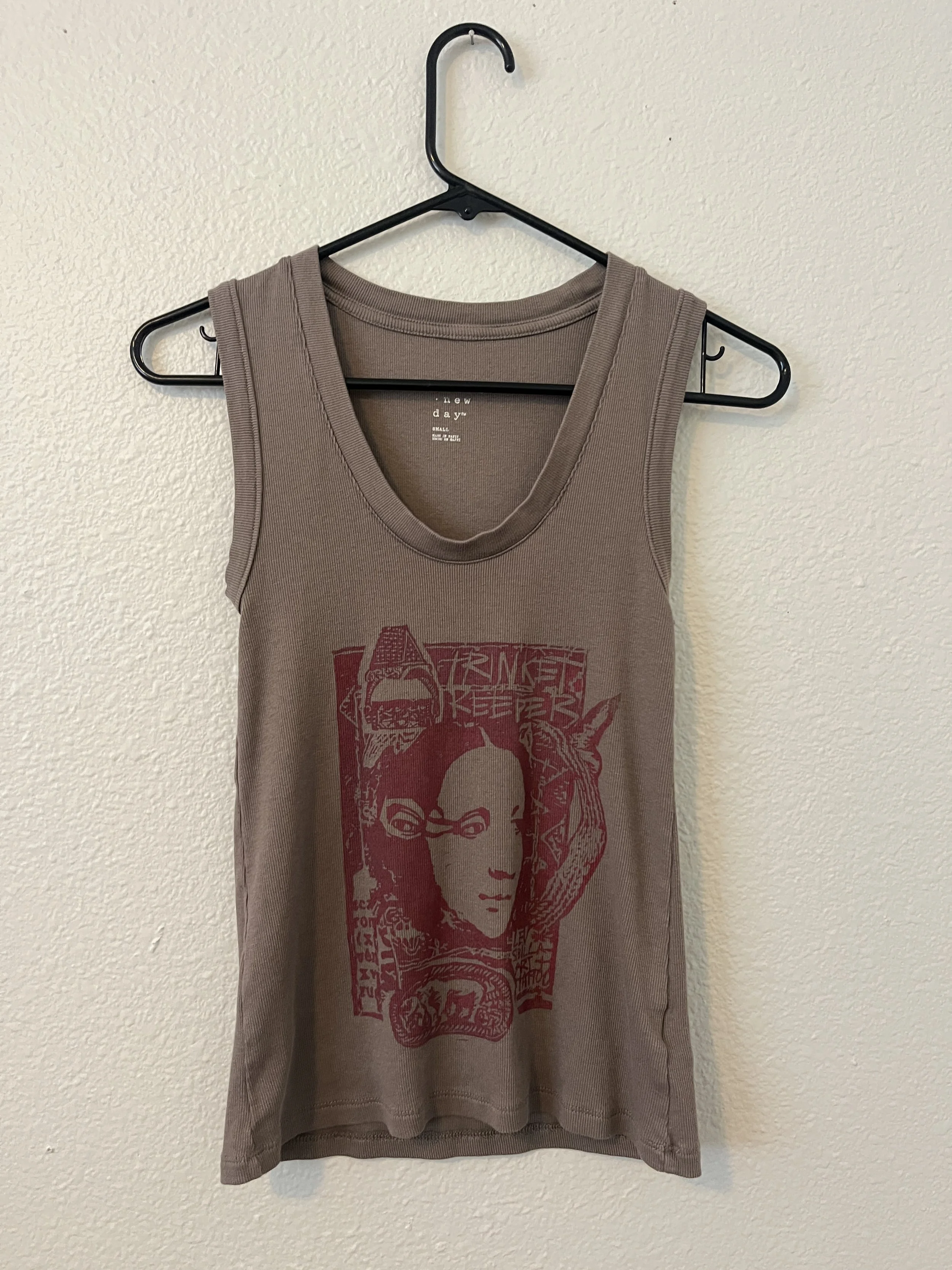 One-of-a-kind block-print in red. Medium brown sleeveless ribbed tank, size S.