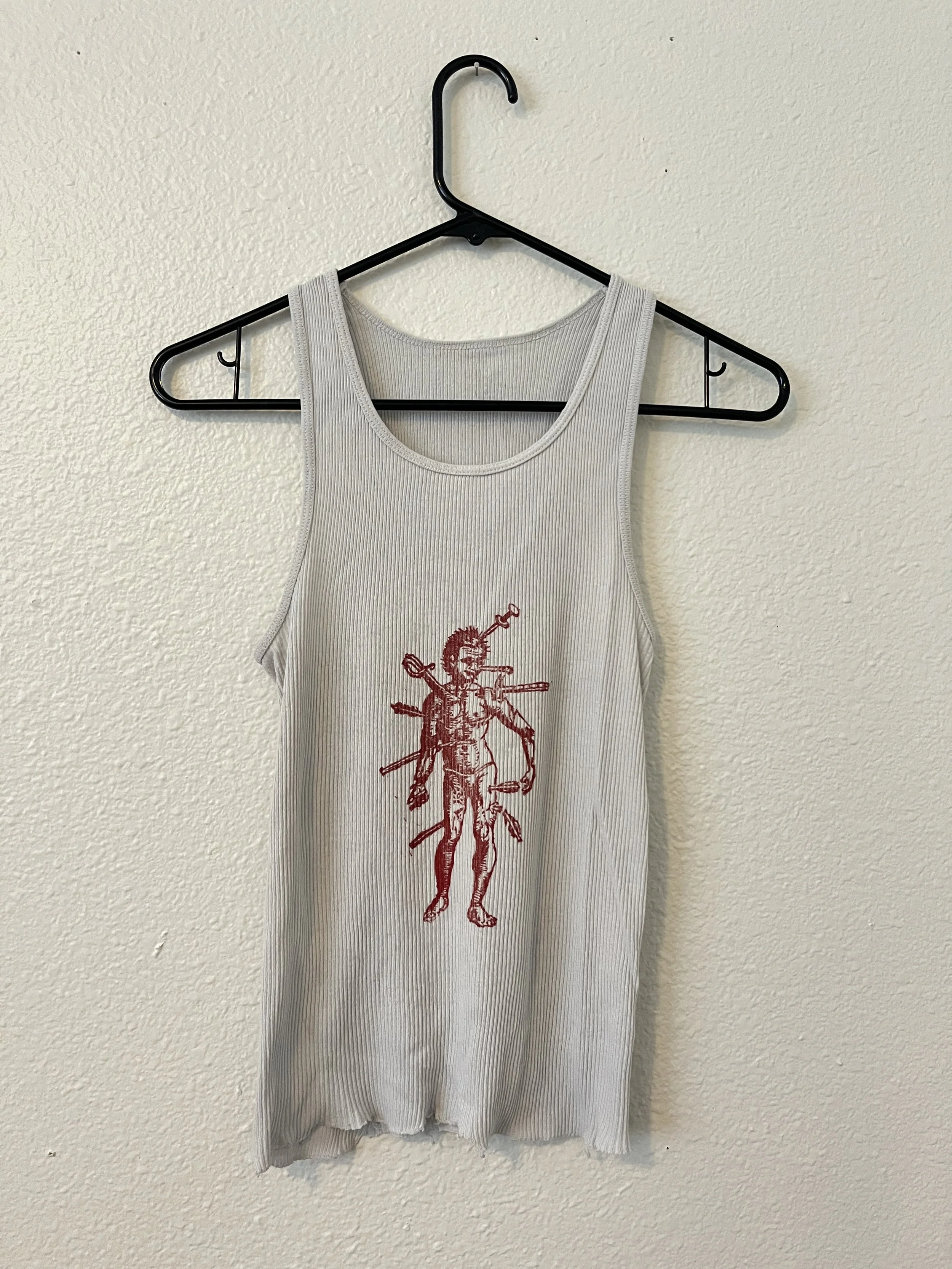 One-of-a-kind block-print in red. Vintage gray ribbed tank, size S/M (unlabeled).