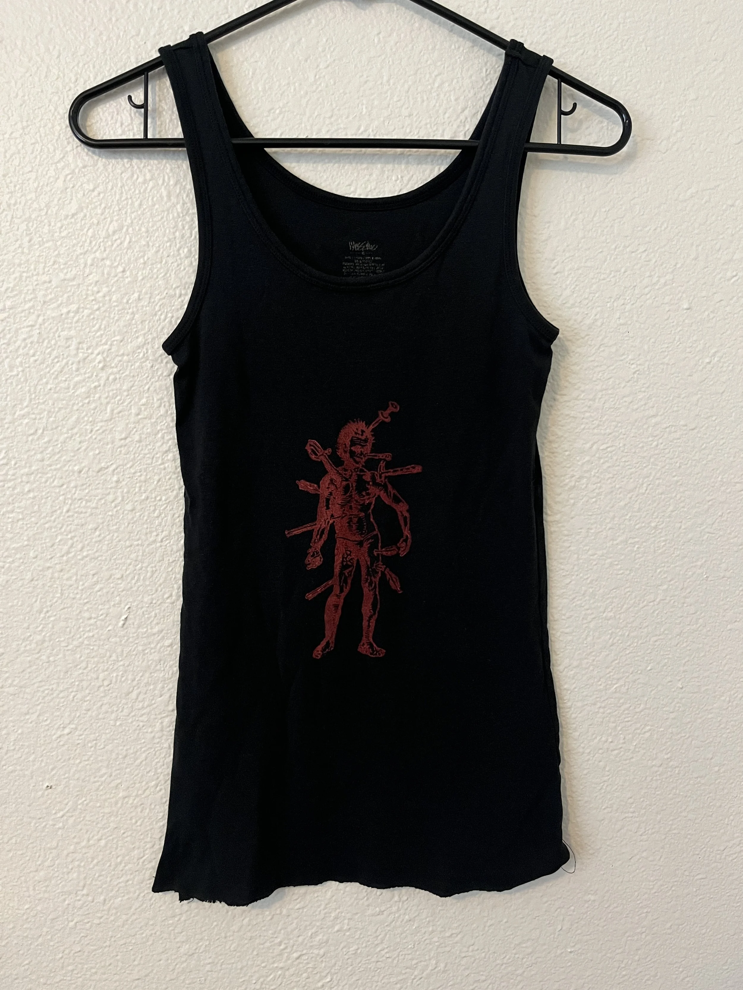 One-of-a-kind block-print in red. Soft black tank, size S/M (unlabeled).