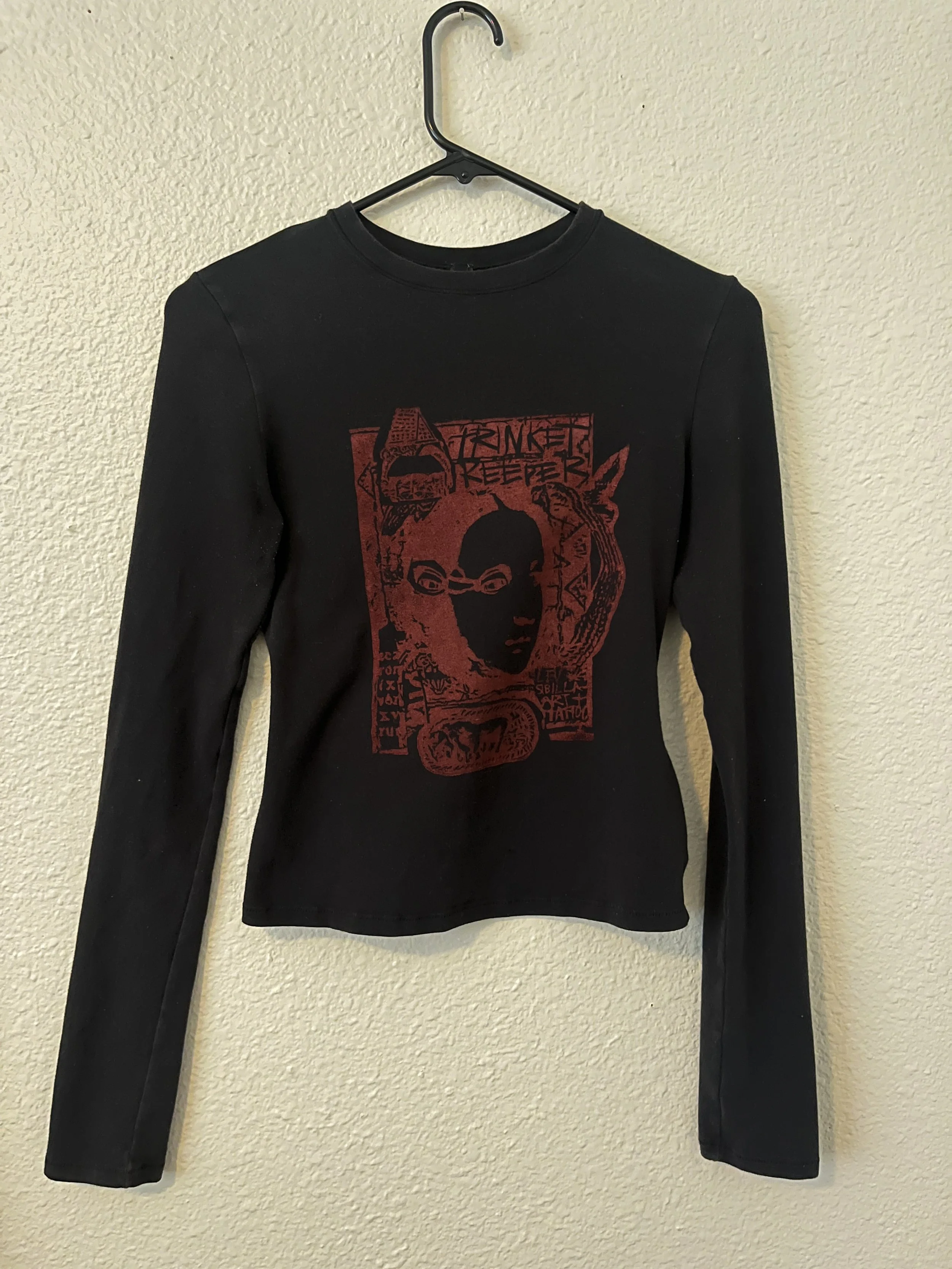 One-of-a-kind block-print in red. Heavyweight black long-sleeve tee. Stretchy, semi-cropped fit.