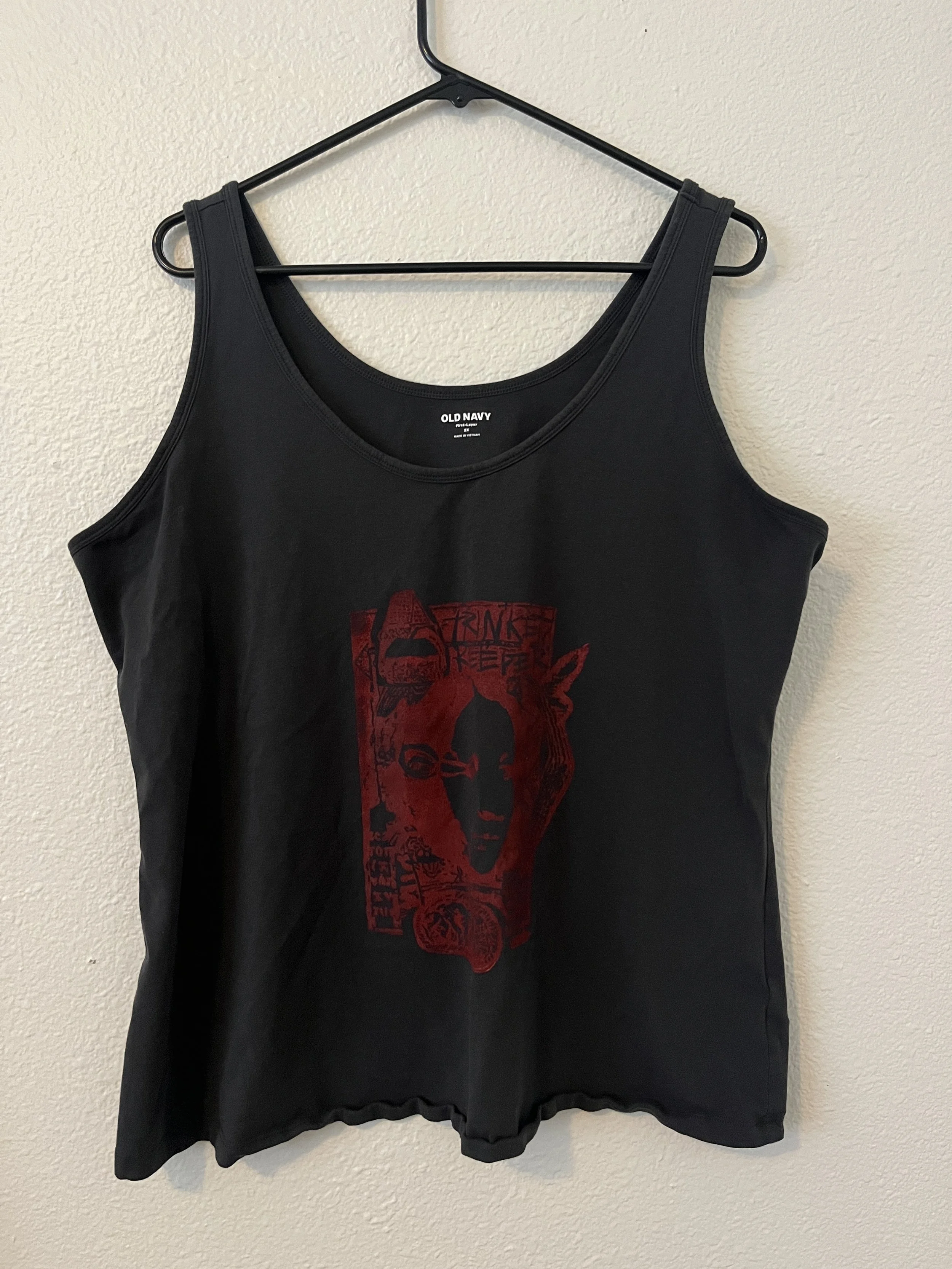 One-of-a-kind block-print in red. Charcoal/black tank, 2XL (“womens”). Low neck, slightly short fit.
